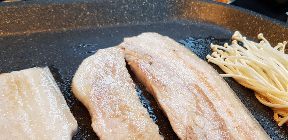달궈진 불판 위로 고기와 버섯을 먼저 구워주다 기름이 나올 때쯤 콩나물 무침과 김치도 얹어 같이 구워주면서 먹었어요!
