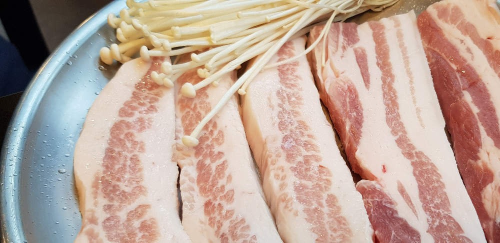 주문한 삼겹살과 항정살, 팽이버섯이 함께 곁들여져 나왔습니다. 삼겹살 1인분 13,000원 항정살 1인분 15,000원입니다.