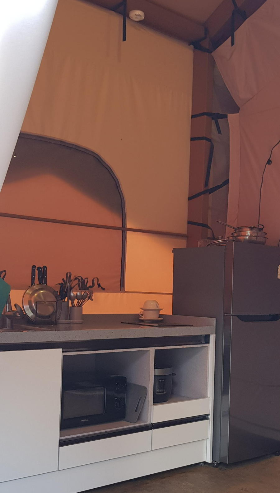 더오창호 글램핑 디럭스 내부 모습을 보면 침대 있는 거실 공간으로 들어가기 전에 주방시설과 테이블, 의자가 준비되어 있습니다.