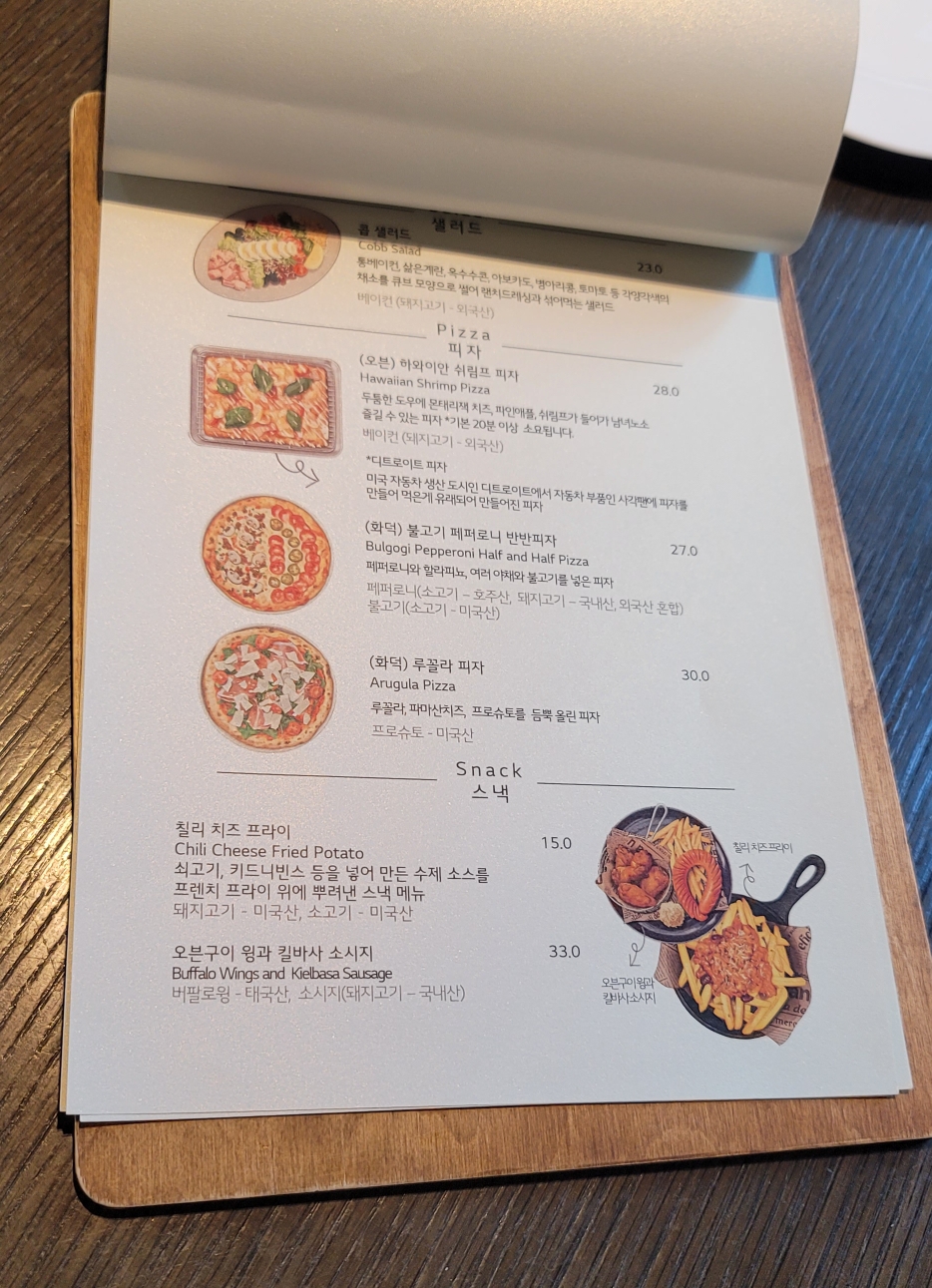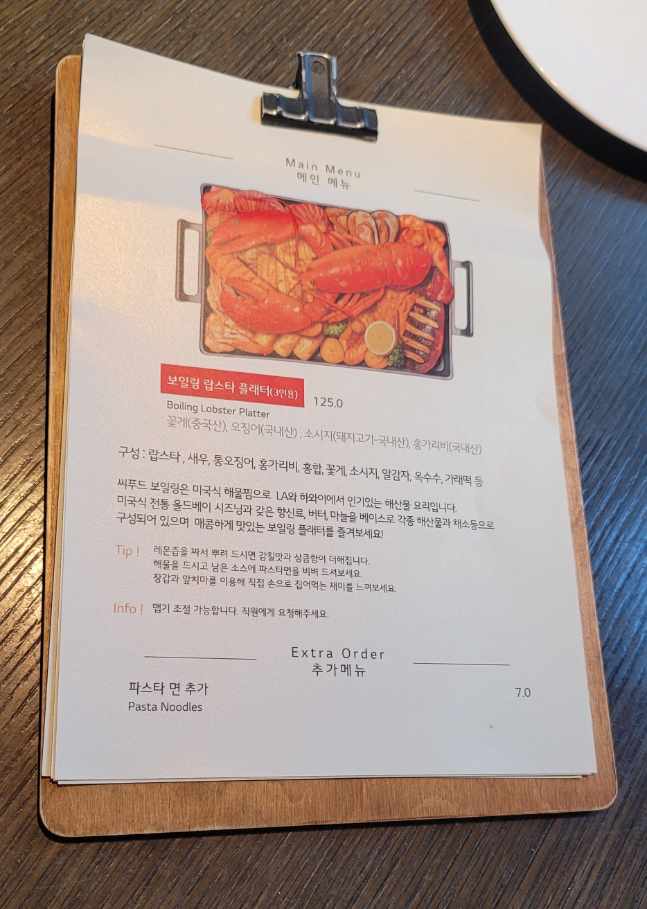 저는 미라시에서 디너 단품 메뉴 식사를 위해 방문했고 메뉴가 생각보다 다양하게 준비되어 있어서 행복하게 메뉴를 고를 수 있었습니다. 방문 전 후기를 살펴보니 대부분 보일링 랍스터 플래터나 시그니처 BBQ 플래터를 드시는 것 같았습니다. 보일링 랍스타 플래터는 3인용 메뉴로 랍스타, 새우, 통오징어, 홍가리비, 홍합, 꽃게, 소시지, 알감자, 옥수수, 가래떡 등이 들어있는 미국식 해물찜으로 미국식 전통 올드베이 시즈닝과 갖은 향신료, 버터, 마늘을 베이스로 매콤한맛을 즐길 수 있는 메뉴라고 합니다. 이외에도 샐러드, 피자, 칠리 치즈 프라이, 오븐구이 윙, 소시지, 파스타, 오므라이스 등이 준비되어 있어 아이들 밥 먹이기에도 좋은 것 같습니다.