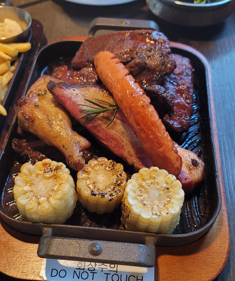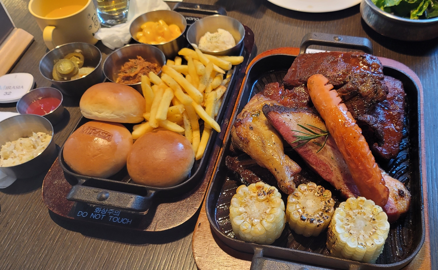 주문한 시그니처 BBQ 플래터가 나왔습니다. 2인이 먹을건데 메뉴판엔 3인용이라고 되어있어서 여쭤보니 조금 많긴 하지만 2인도 충분히 먹을 만한 양이고 남은 음식은 포장도 가능하다고 설명해주셨습니다. 미라시아 시그니처 BBQ 플래터는 LA갈비, 로인립, 스페어립, 폴드포크, 소시지, 베이컨, 닭다리, 매쉬드 포테이토, 맥앤치즈, 감자튀김, 옥수수, 빵으로 구성되어있습니다.