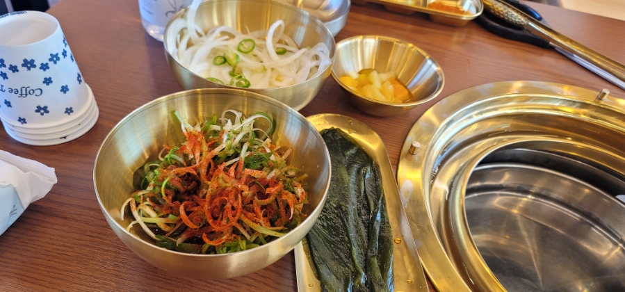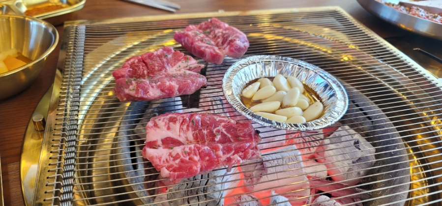 셀프바에서 마늘과 참기름도 가져와 올려주고 생소갈비살부터 맛보기로 합니다.