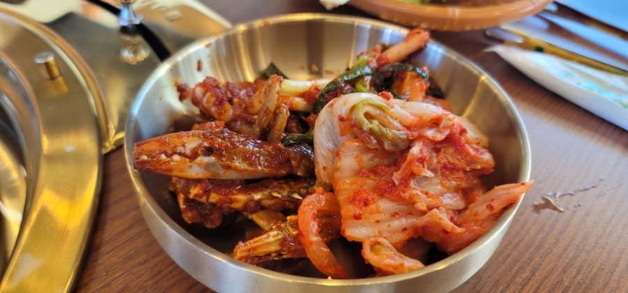 기본찬은 양파절임, 파채무침, 명이나물, 후르츠 칵테일이 나오고 셀프바에서 파김치, 배추김치, 꽃게장도 있고