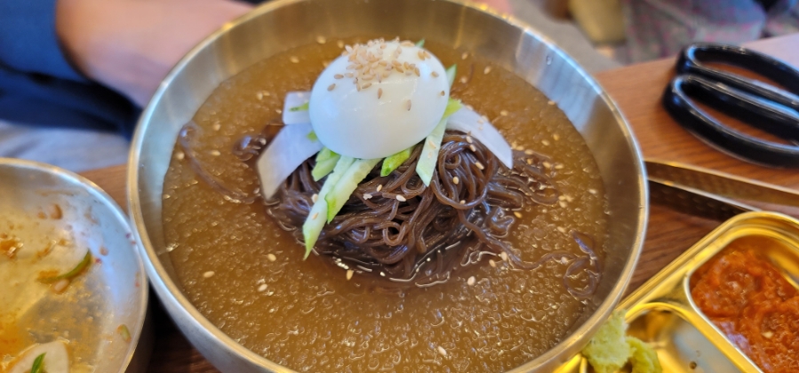 소고기를 배불리 먹어 속이 살짝 느끼해졌으니 구수한 된장찌개와 새콤한 물 칡냉면으로 내려줘야겠지요.