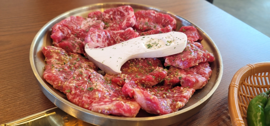 제가 주문한 메뉴는 반반소갈비살 500g이고 넓은 접시에 생소갈비살과 양념 소갈비살, 새송이버섯이 담겨 나옵니다.