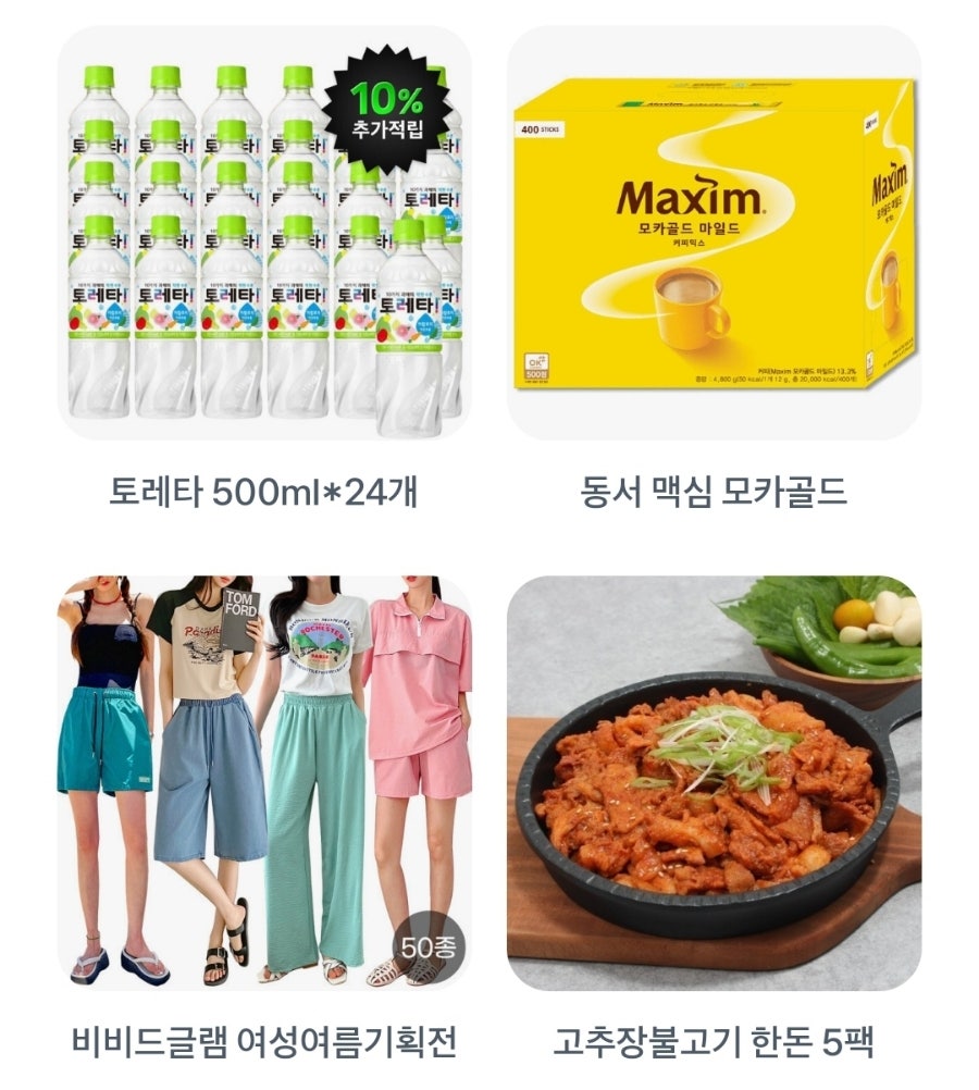 6월 13일 토스 두근두근 1등 찍기 오늘의 후보는 토레타 500ml*24개, 동서 맥심 모카골드, 비비드글램 여성여름기획전, 고추장불고기 한돈 5팩, 다온샵 여성여름기획전, 스파클 2L, 해남 꿀고구마, 망고향 스테비아 방울토마토, 대숲맑은담양쌀, 크리넥스 화장지 24롤2팩입니다.