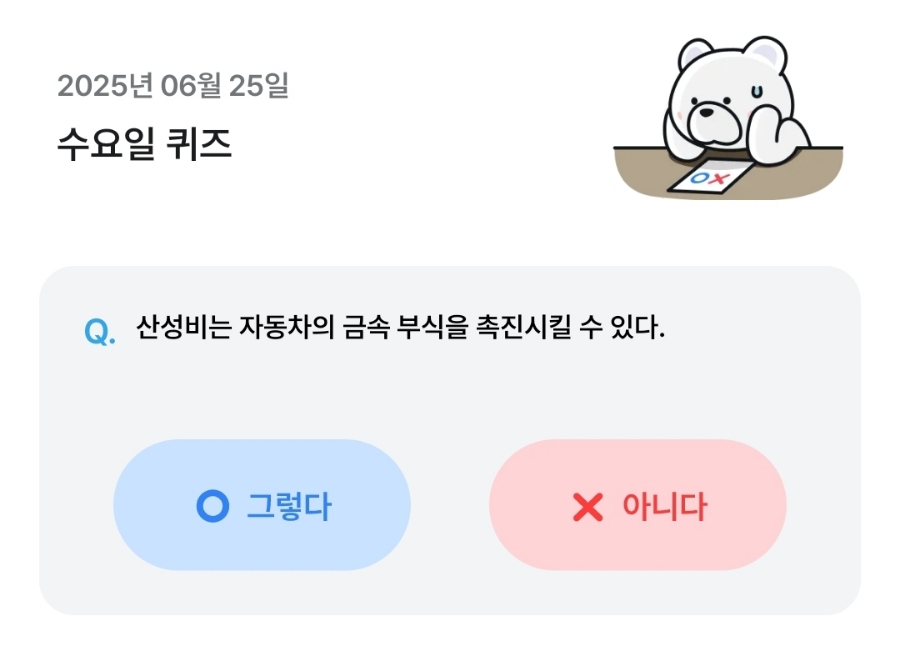 Q. 산성비는 자동차의 금속 부식을 촉진시킬 수 있다.