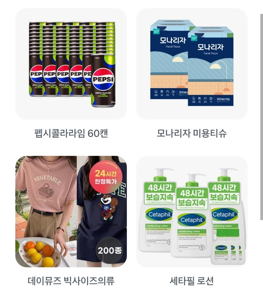 7월16일 토스 두근두근 1등 찍기 오늘의 후보는 펩시콜라라임 60캔, 모나리자 미용티슈, 데이뮤즈 빅사이즈의류, 세타필 로션, 베베숲 프라임 아기물티슈, 땅콩버터 노슈거 2개, 크록스 인기 클로그, 토레타, 모노시크 반팔티셔츠, 갈비탕 5팩 입니다.