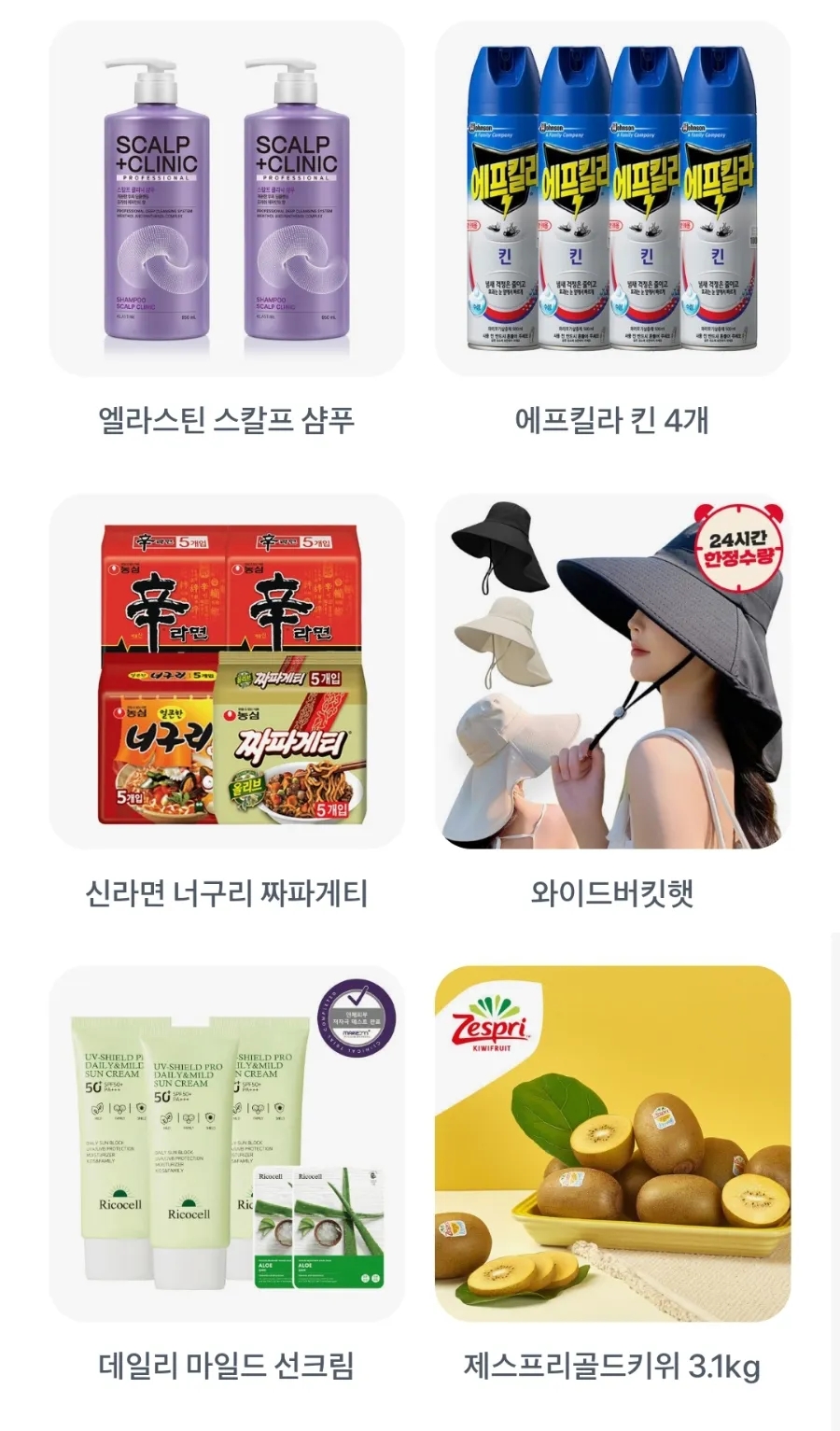 8월7일 토스 두근두근 1등 찍기 오늘의 후보는 엘라스틴 스칼프 샴푸, 에프킬라 킨 4개, 신라면 너구리 짜파게티, 와이드 버킷햇, 데일리 마일드 선크림, 제스프리 골드키위, 차음료 기획전, 여름 여성 기획전, 싱싱한 완도 전복, 아이스 반팔티 입니다.