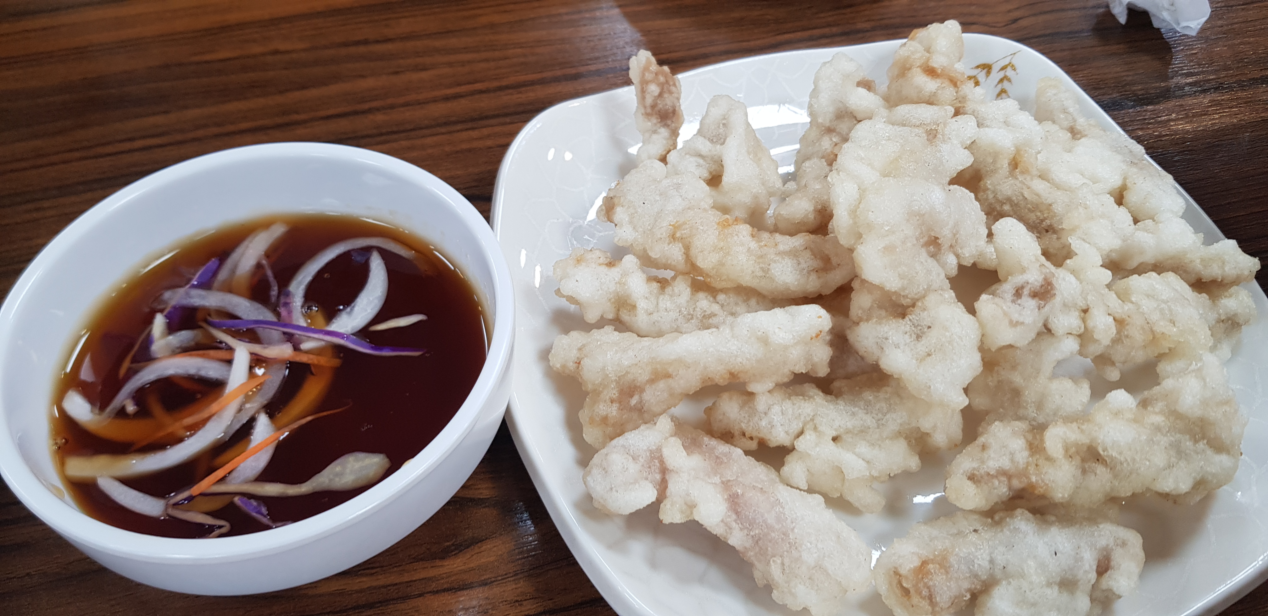 주문했던 메뉴들의 맛이 좋아서 추가로 주문한 미니 탕수육입니다. 이럴 거면 처음부터 세트메뉴를 시켰어야 했나 후회했지만 요 한 접시는 단돈 만원이니 괜찮은 가격대인 듯합니다. 신선하고 깨끗한 기름에 튀겨져 튀김의 색이 뽀얀 색이 나네요! 약간 바삭하면서 쫀득한 느낌의 탕수육이라 제 입맛엔 정말 맛있었습니다.