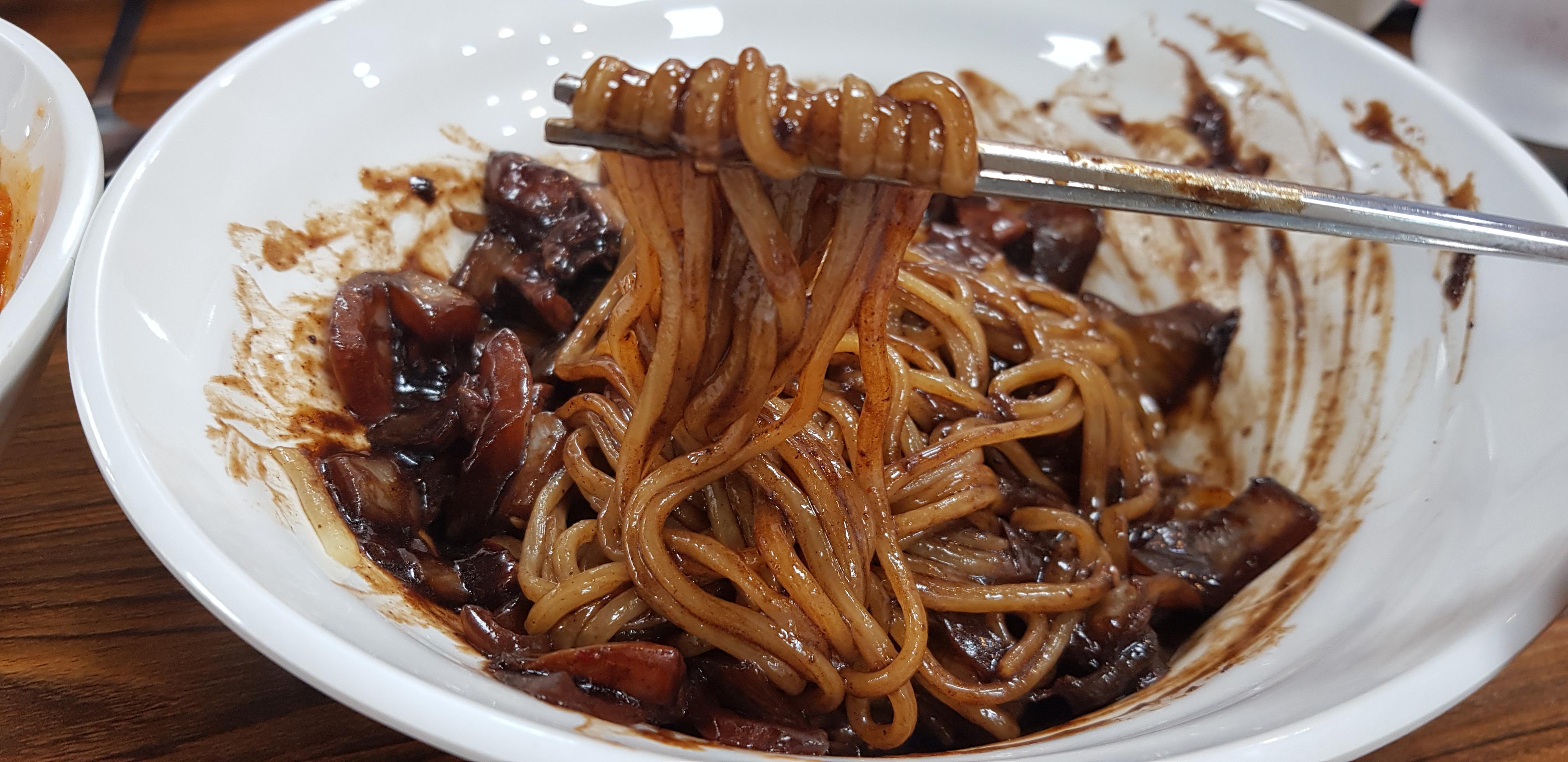 이날은 어떤 이유에서인지 간짜장을 주문했는데 비비는 동안 진한 빛깔과 구수한 향이 코를 찔러 얼른 한입 먹어보았습니다.