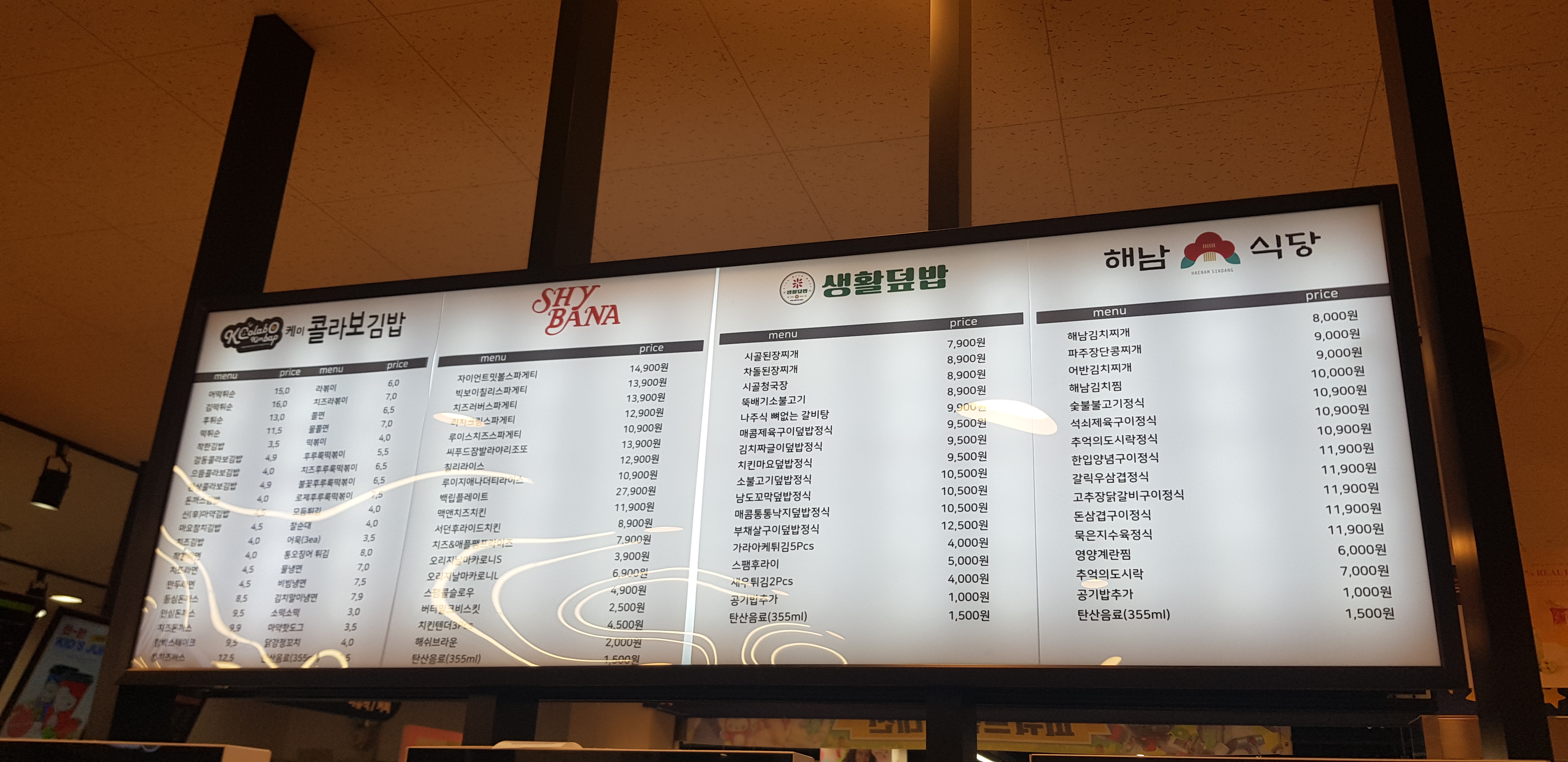 매장 전체가 좀 더 깔끔해진 느낌과 케이콜라보김밥, 샤이바나, 생활덮밥, 해남식당, 롯데리아 매장이 있고 전보다 메뉴도 다양해져서 이것저것 주문하기도 좋아졌어요