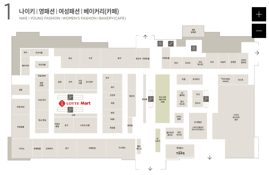 청주 롯데아울렛 1층 매장은 나이키 매장과 롯데마트 매장이 있고 지역 유명 베이커리 카페인 바누아투도 입점했습니다. 이외에 여성 캐주얼 브랜드 데코, 모조에스핀, 미샤, 지고트와 영캐주얼 브랜드 주크, 나이스크랍, 듀엘, 라인, 리스트, 보브, 씨씨콜렉트, 에고이스트, 온앤온, 올리브데올리브, 잇미샤, 쥬시쥬디와 영패션 코데즈컴바인, 써스데이 아일랜드와 해외패션 롯데TOPS가 입점해있습니다.